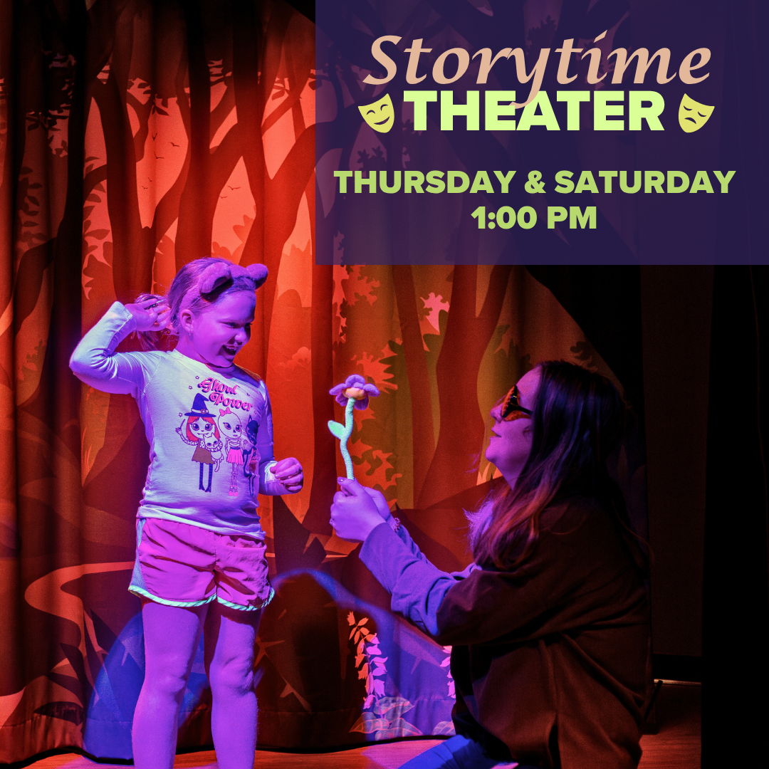 Stories leap off the page and onto the stage at Storytime Theater! Join us every Thursday and Saturday at 1:00 PM in the My Town Theater for an interactive storytelling adventure where imagination takes center stage!